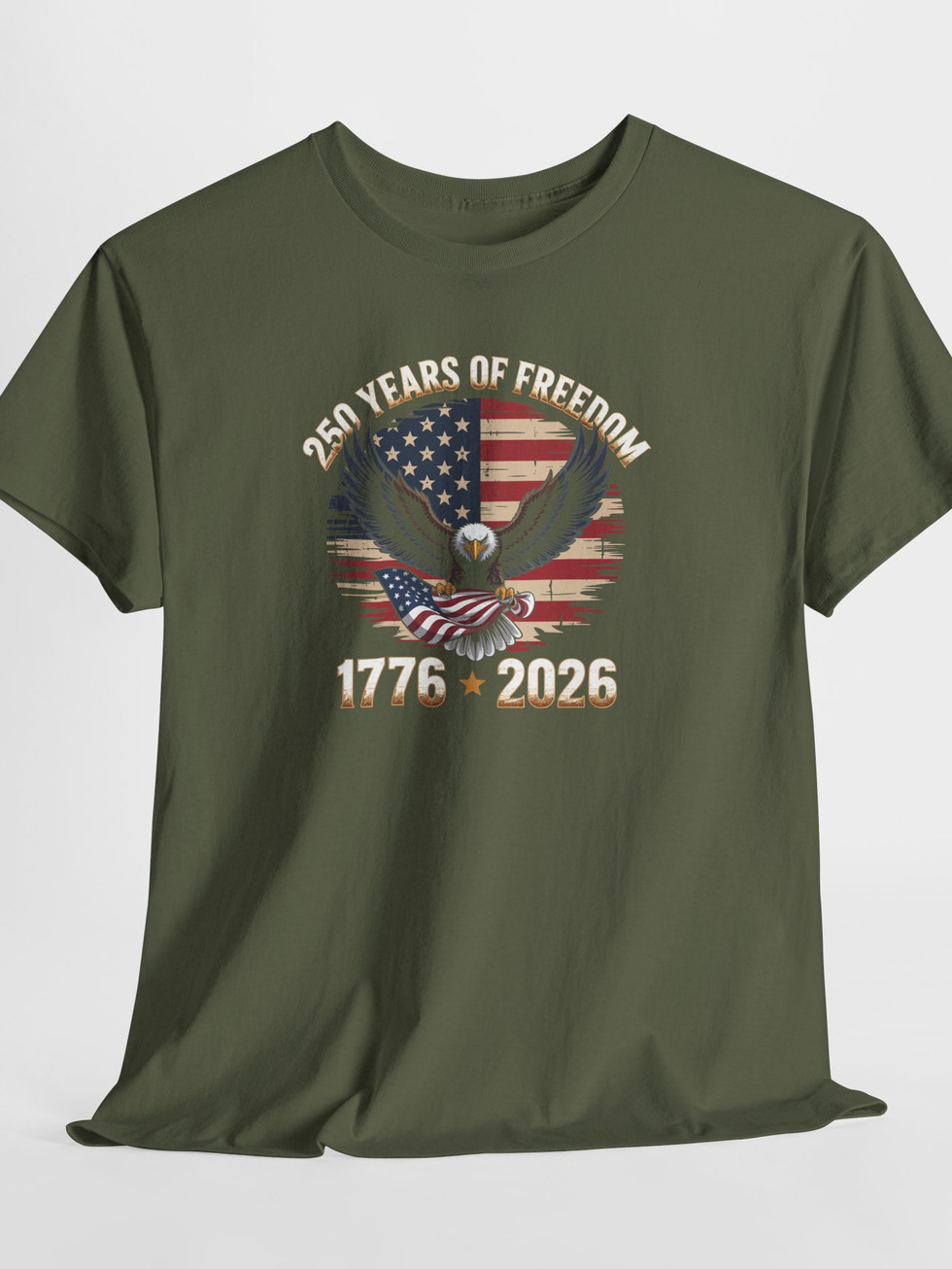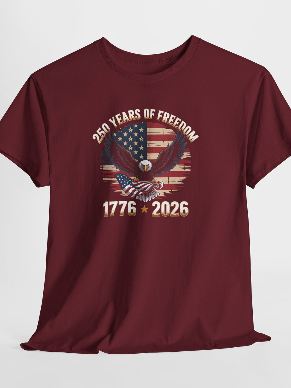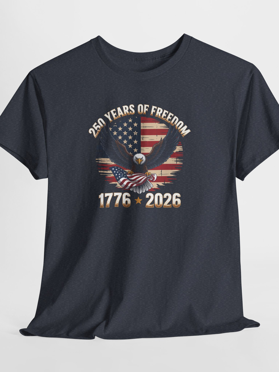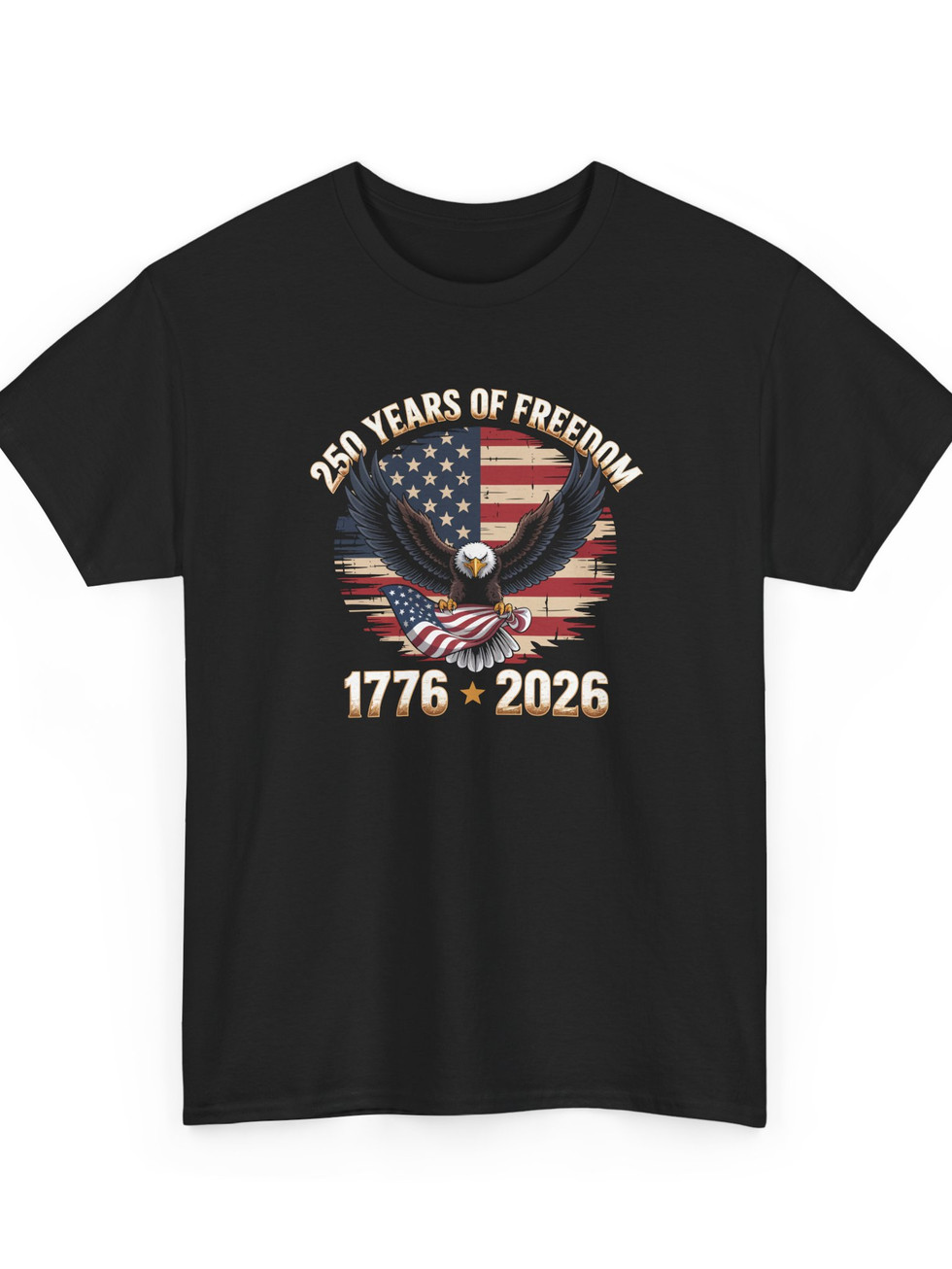A bold, patriotic tee that carries vintage Americana energy. The front shows a proud bald eagle against a weathered American flag with the text “250 Years of Freedom” and the dates 1776 • 2026. The worn, retro tones give the design a lived-in look — like a well-traveled banner folded into a shirt. It sits on a relaxed, classic crew-neck silhouette that layers easily under a jacket or stands alone at a BBQ, parade, or community gathering. Breathable, mid-weight cotton feels sturdy yet comfortable for long summer days and evening celebrations. The understated back keeps the focus on the emblem at the front, letting the message speak clearly without fuss.
