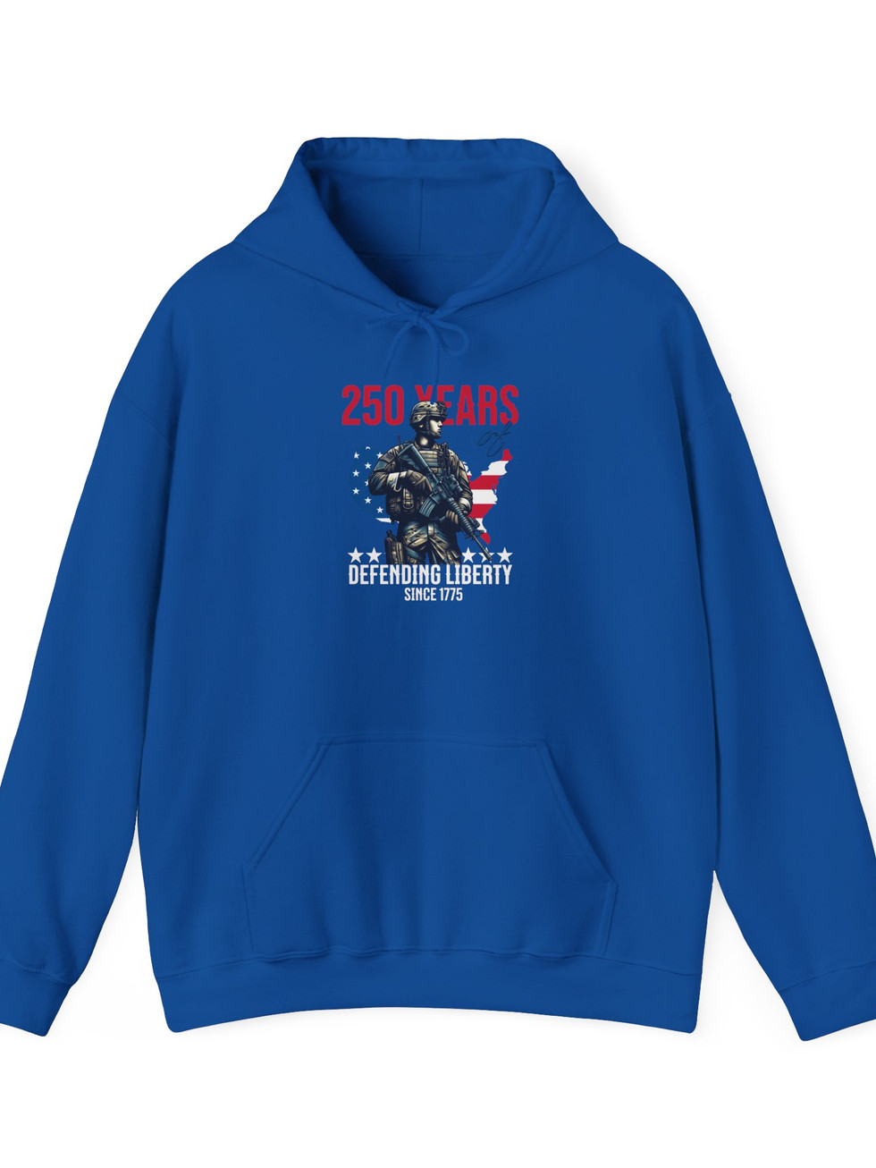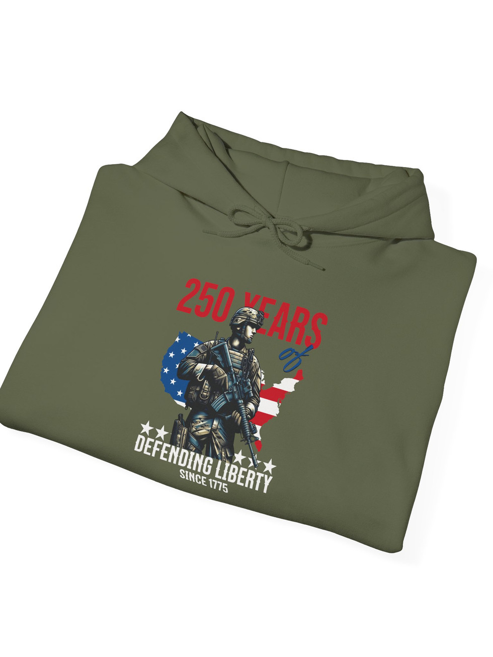 250 Years Defending Liberty - American Flag Soldier Anniversary Hoodie