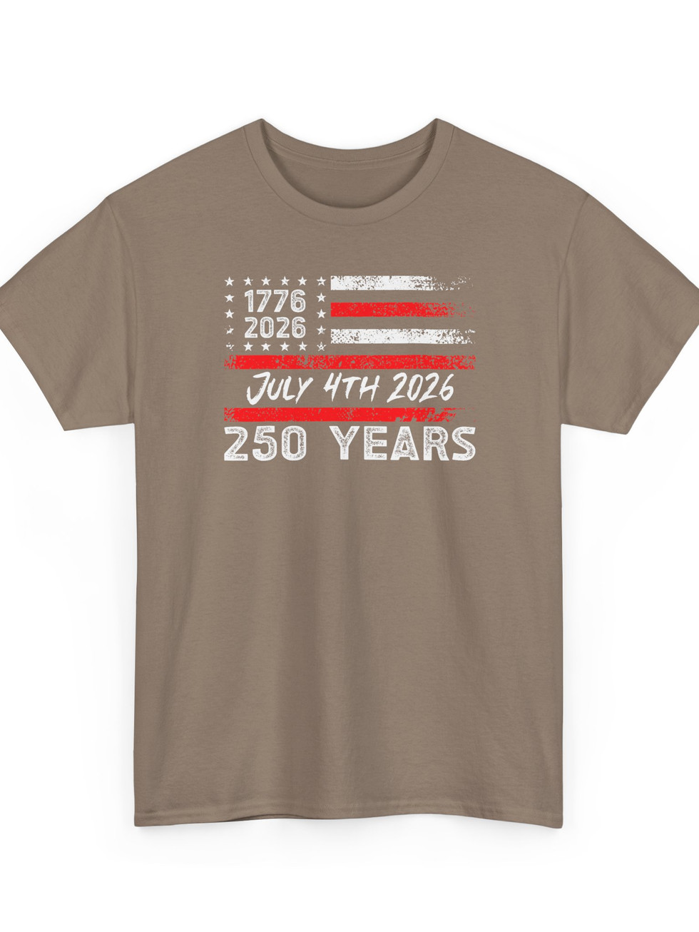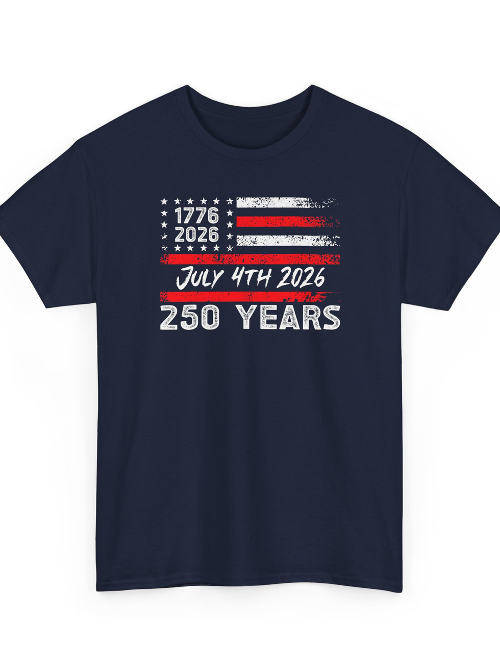Celebrate a rare milestone with a rugged, lived-in tee that speaks like a hometown banner. This classic crew shirt carries a distressed flag graphic and bold “1776 — 2026 / July 4th 2026 / 250 YEARS” lettering, the kind of vintage-finished design that looks like it’s been through parades, backyard barbecues, and late-night talks on porch steps. The relaxed fit and medium-weight cotton drape easily over a flannel or under a summer jacket. Wear it to mark the conversation — to honor history, family tradition, and the long, imperfect story that connects generations. It’s an easy, honest piece for people who show pride without flash: think neighborhood cookouts, small-town celebrations, and evenings watching fireworks with friends who remember the same summers you do.