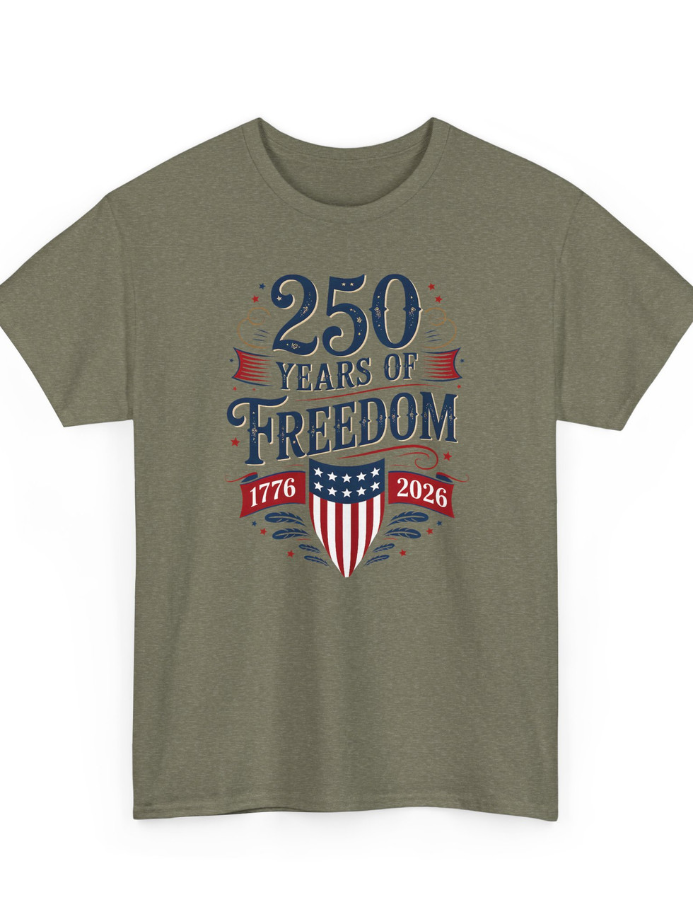 Celebrate a long legacy with this classic cotton tee that feels like home the moment you put it on. The vintage-inspired “250 Years of Freedom” design combines bold numerals, ribbon banners, and a shield motif in muted patriotic reds and blues — a subtle, confident statement rather than loud fanfare. Lightweight yet sturdy, the shirt sits relaxed across the shoulders and holds its shape thanks to a ribbed collar and shoulder tape. Wear it to backyard cookouts, community parades, or quiet moments of reflection on the porch; it layers easily under a denim jacket or stands alone with jeans. The artwork has crisp, detailed printing that stays true wash after wash, so the message ages with you.