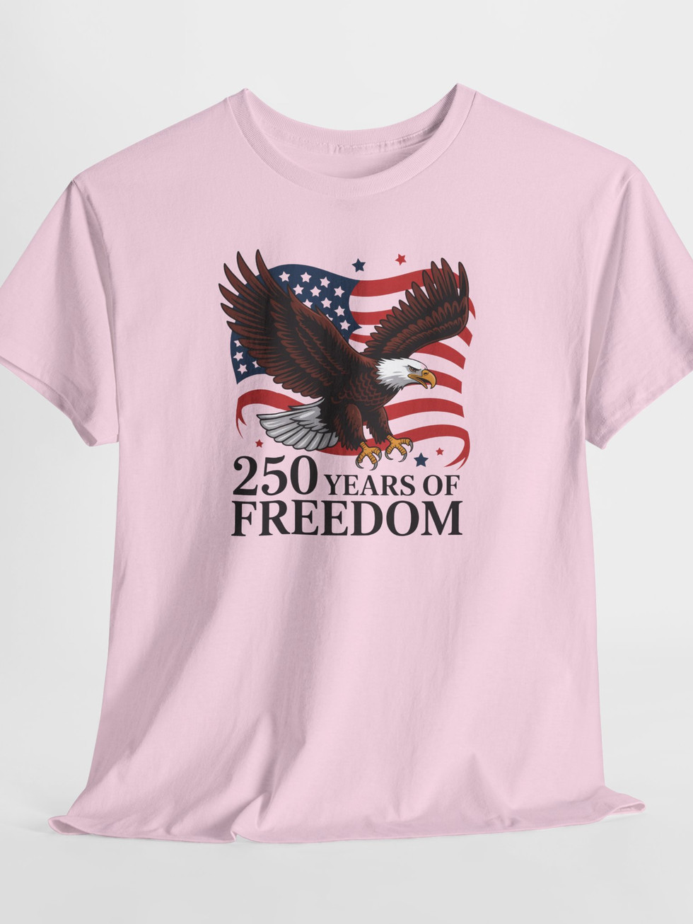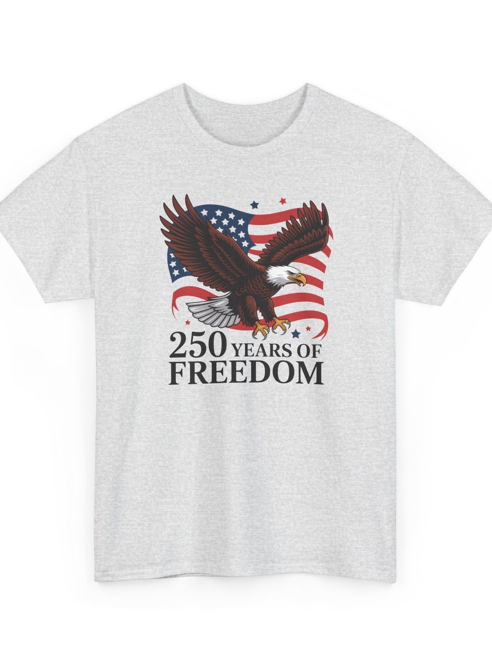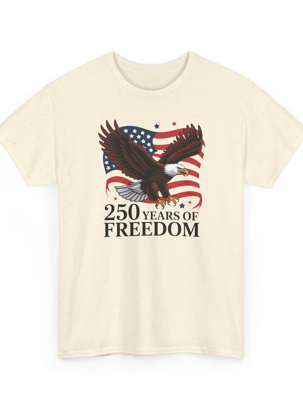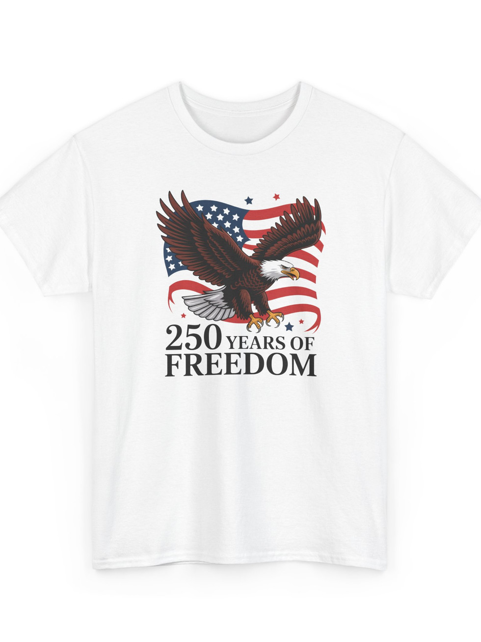 A bold, vintage-inspired tee that wears like a salute. A soaring bald eagle arcs across a waving American flag, the whole composition anchored by the proud line “250 Years of Freedom.” The design reads like a moment frozen — fireworks-ready energy, weathered graphic tones, and a clear message of patriotism without being flashy. The midweight cotton holds the print crisply, while the classic crew neck and relaxed cut let this shirt move from backyard barbecues to parades with steady, comfortable confidence. For someone who keeps American history and hard-won liberties close to heart, this shirt feels thoughtful, sturdy, and unmistakably honest.