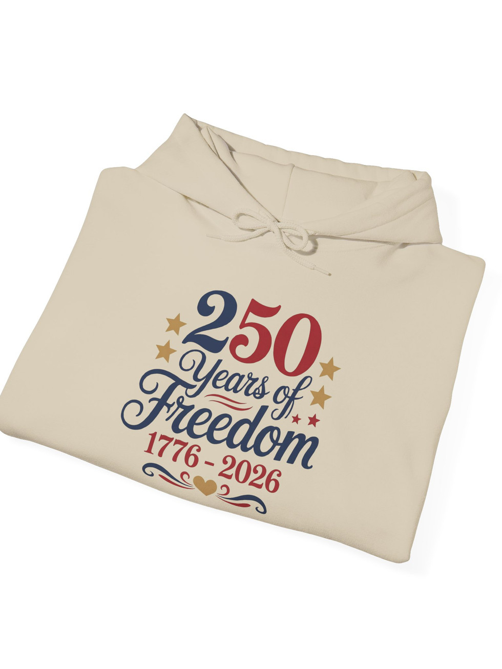 Celebrate a slice of history with a soft, cozy hooded sweatshirt made for quiet pride and everyday wear. The front design reads “250 Years of Freedom 1776–2026” in warm, vintage-inspired type with small star accents and subtle flourishes. It sits centered on a clean white background, giving the artwork room to breathe and making the lettering the focus. Slip it on for cool evenings, casual parade days, or low-key family gatherings — it feels lived-in from the first wear and carries a calm, commemorative energy rather than loud fanfare. The roomy kangaroo pocket keeps hands warm and the double-lined hood adds structure and comfort. This sweatshirt pairs well with denim, layered under a jacket, or worn alone while watching fireworks or sharing stories of home.