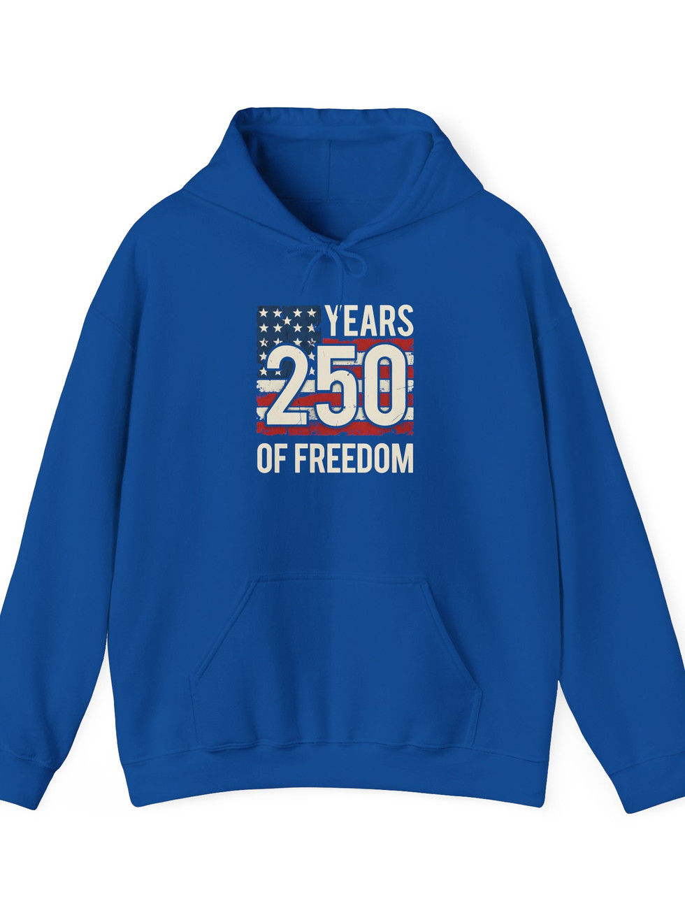 This soft, mid-weight hoodie carries a quiet, nostalgic pride — the distressed stars-and-stripes work framing bold “250 Years of Freedom” numbers that feel lived-in and real. The double-lined hood and color-matched drawcord add durable, subtle style, while the roomy kangaroo pocket and classic fit make it a go-to layer for cool mornings or late-night bonfires. It settles into everyday wear: you can throw it on for a backyard barbecue, a Fourth of July parade, or a reflective walk through town. The print’s weathered look pairs with worn denim or cargos, and the tactile fabric blend keeps the design sharp wash after wash.