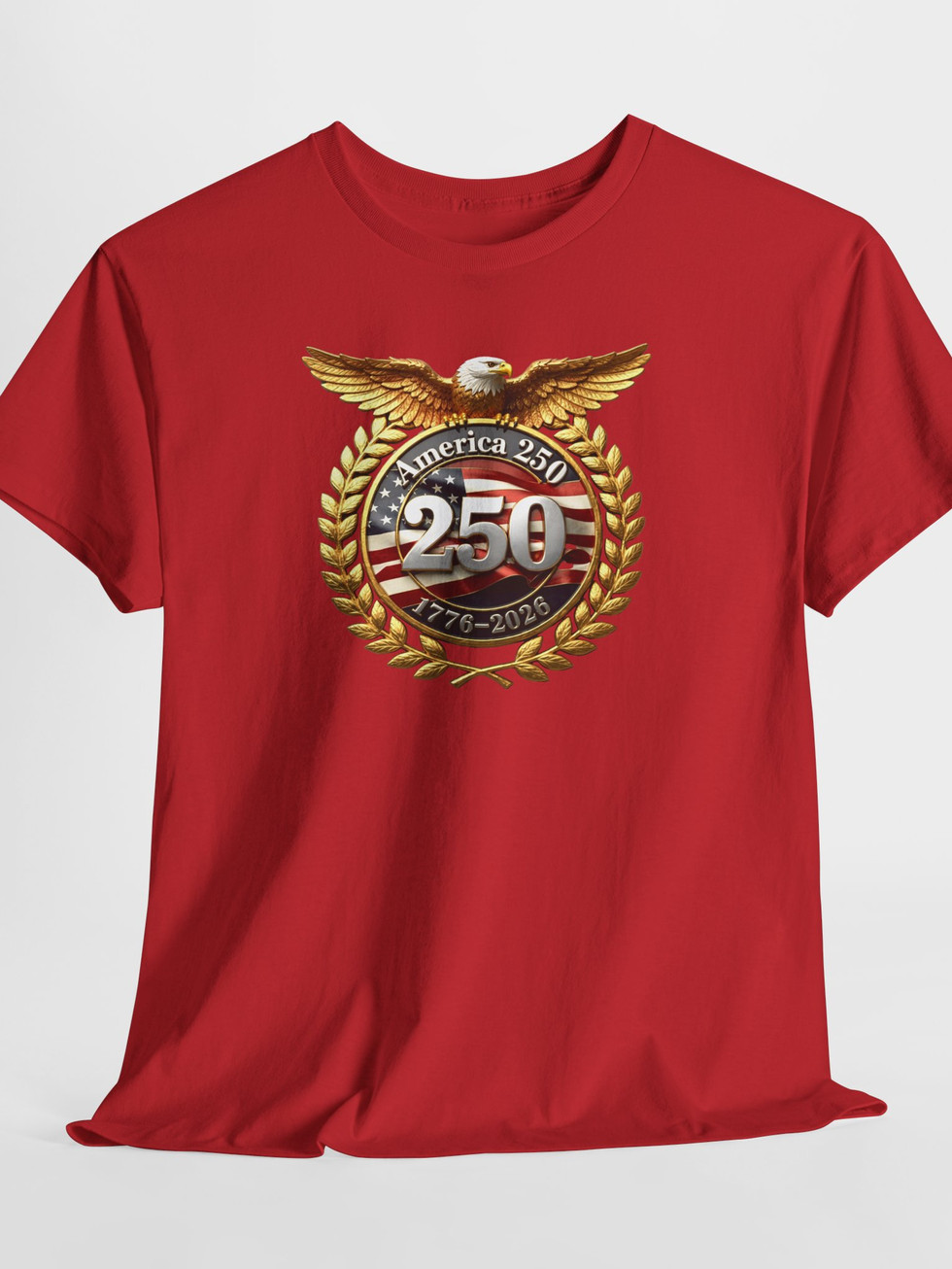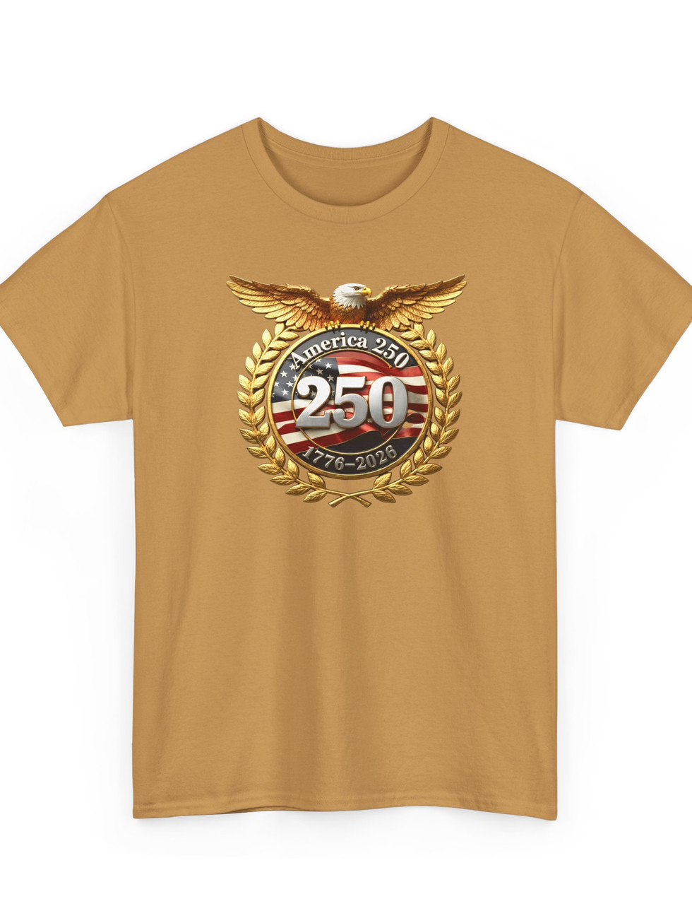 Celebrate a milestone with a bold, wearable emblem that channels pride and heritage. This classic cotton tee wears a vintage-inspired medallion: an American-flag motif framed by golden laurel leaves and wings, with a prominent “250” badge at its center. It sits cleanly on the chest, giving a statement look without shouting—comfortable, breathable, and made to be worn often. Put it on for local parades, history meetups, or backyard gatherings and feel anchored to a shared story every time you step outside.
