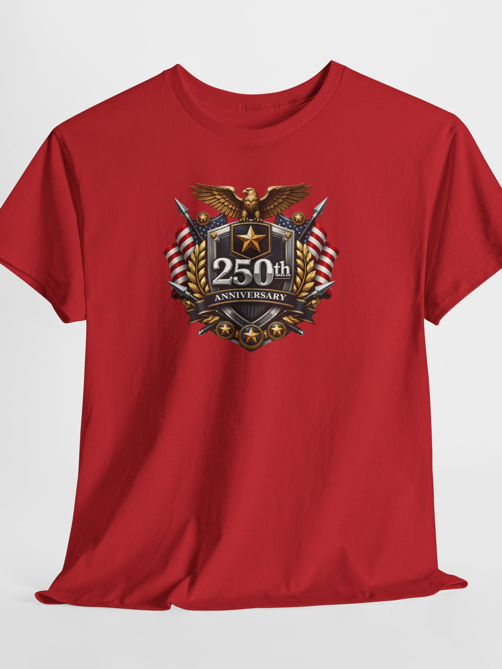 This classic cotton tee wears its pride openly. A bold heraldic emblem—eagle, stars, crossed flags and laurel—frames a striking “250th Anniversary” shield printed on the chest, giving the shirt a ceremonial, commemorative feel. The medium-weight cotton and relaxed crew-neck cut make it comfortable for long days at parades, memorial gatherings, or casual meetups with fellow history lovers. Subtle vintage shading in the print keeps the look grounded and wearable, while the clear DTF/DTG printing preserves sharp details so the artwork reads from a distance. Wear it to mark milestone events, show allegiance at community observances, or as a conversation-starting layer during patriotic outings.