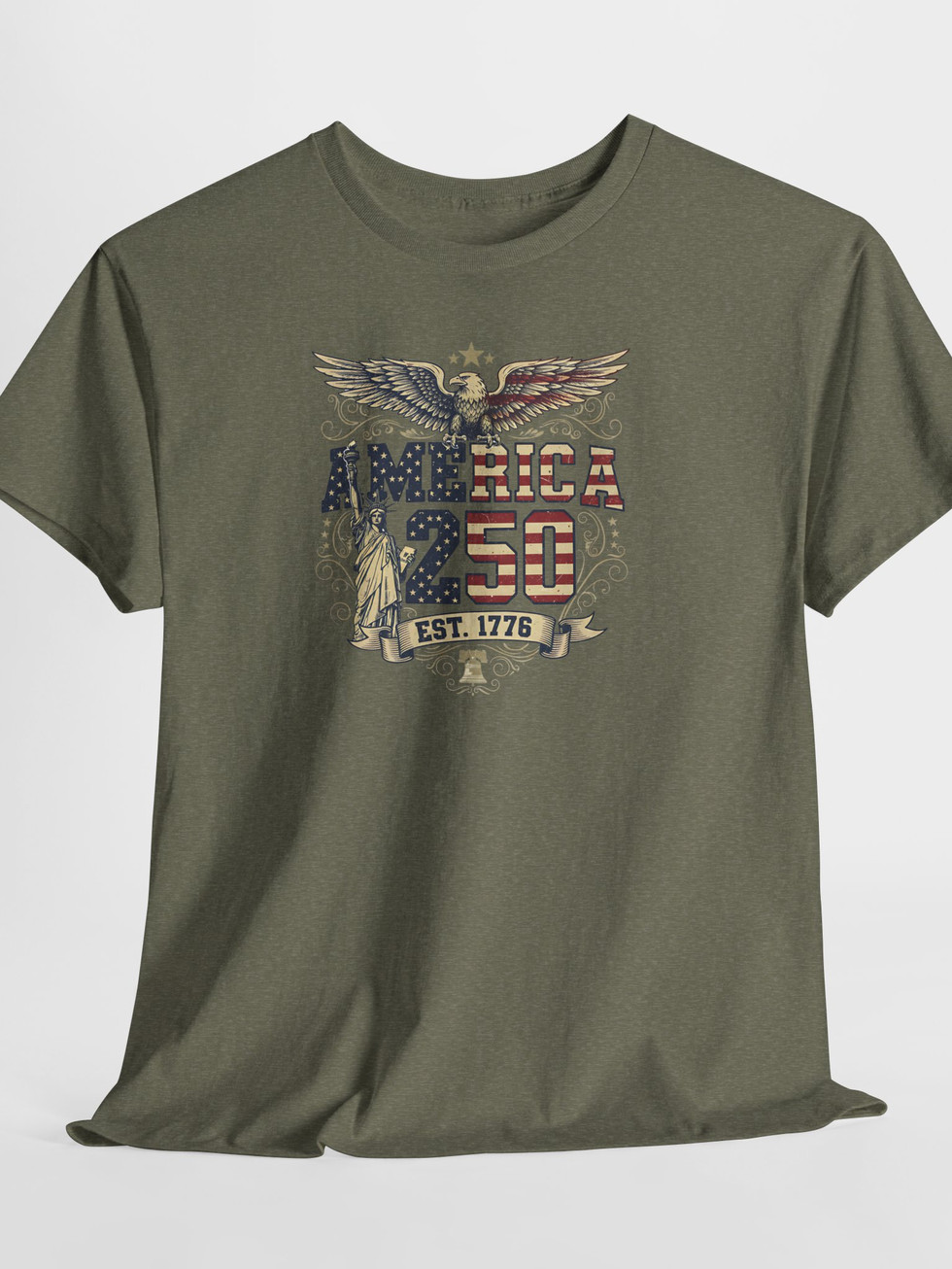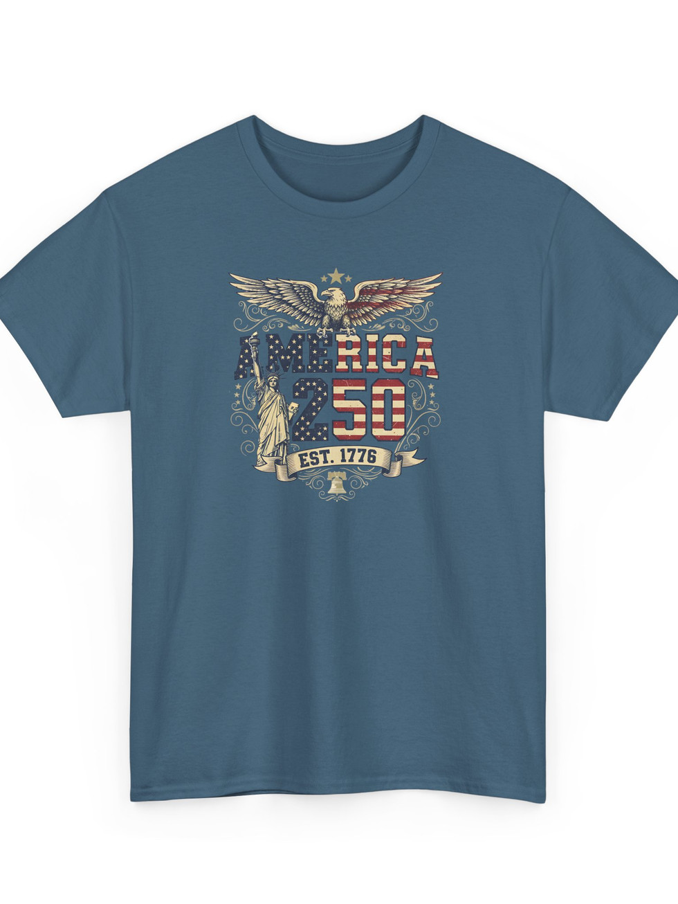 A soft, durable tee that wears like a piece of personal history. This classic crew shirt carries a vintage-inspired America 250 graphic — eagle wings spread, Statue of Liberty silhouette, and distressed stars-and-stripes lettering — evoking backyard parades, small-town pride, and slow summer evenings. Lightweight but sturdy midweight cotton keeps the shape wash after wash. Layer it under a denim jacket for town celebrations or throw it on for a morning coffee and a walk through familiar streets. The print’s aged look blends with lived-in fabric for an authentic, well-loved feel that settles into your routine.