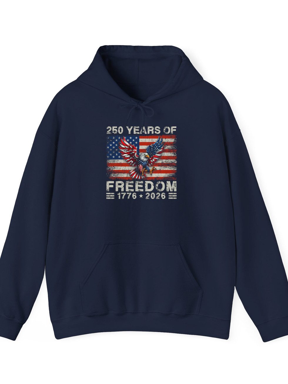 A warm, rugged hoodie that wears its pride openly. The soft 50/50 cotton-poly blend feels cozy on cool mornings while the double-lined, color-matched hood and roomy kangaroo pocket keep hands and head sheltered. The front graphic — a distressed American flag with a soaring eagle and "260 Years of Freedom 1776–2026" — reads like a weathered banner from a summer parade or a backyard barbecue at dusk. It settles into your rotation for roadside stands, flag-raising mornings, and long drives down quiet country lanes. Built with no side seams and tear-away labeling for comfort, plus durable DTF/DTG printing that holds up through washes, this hoodie is made to be worn often and remembered.