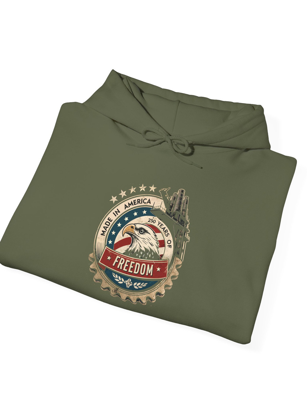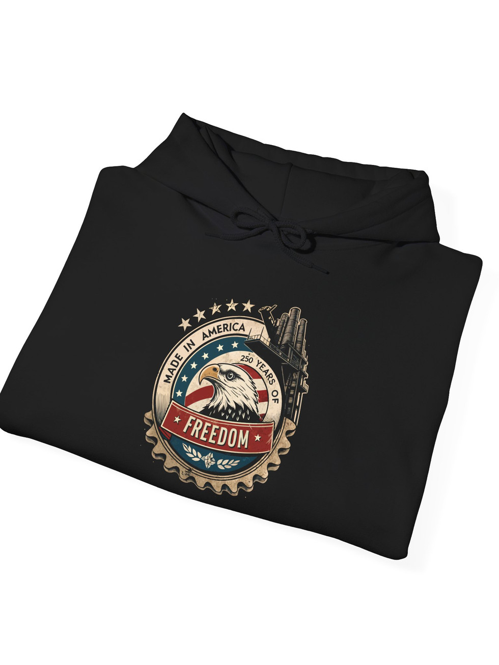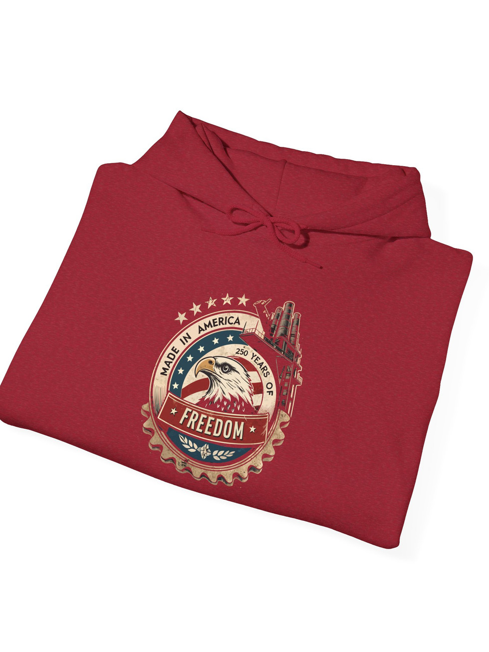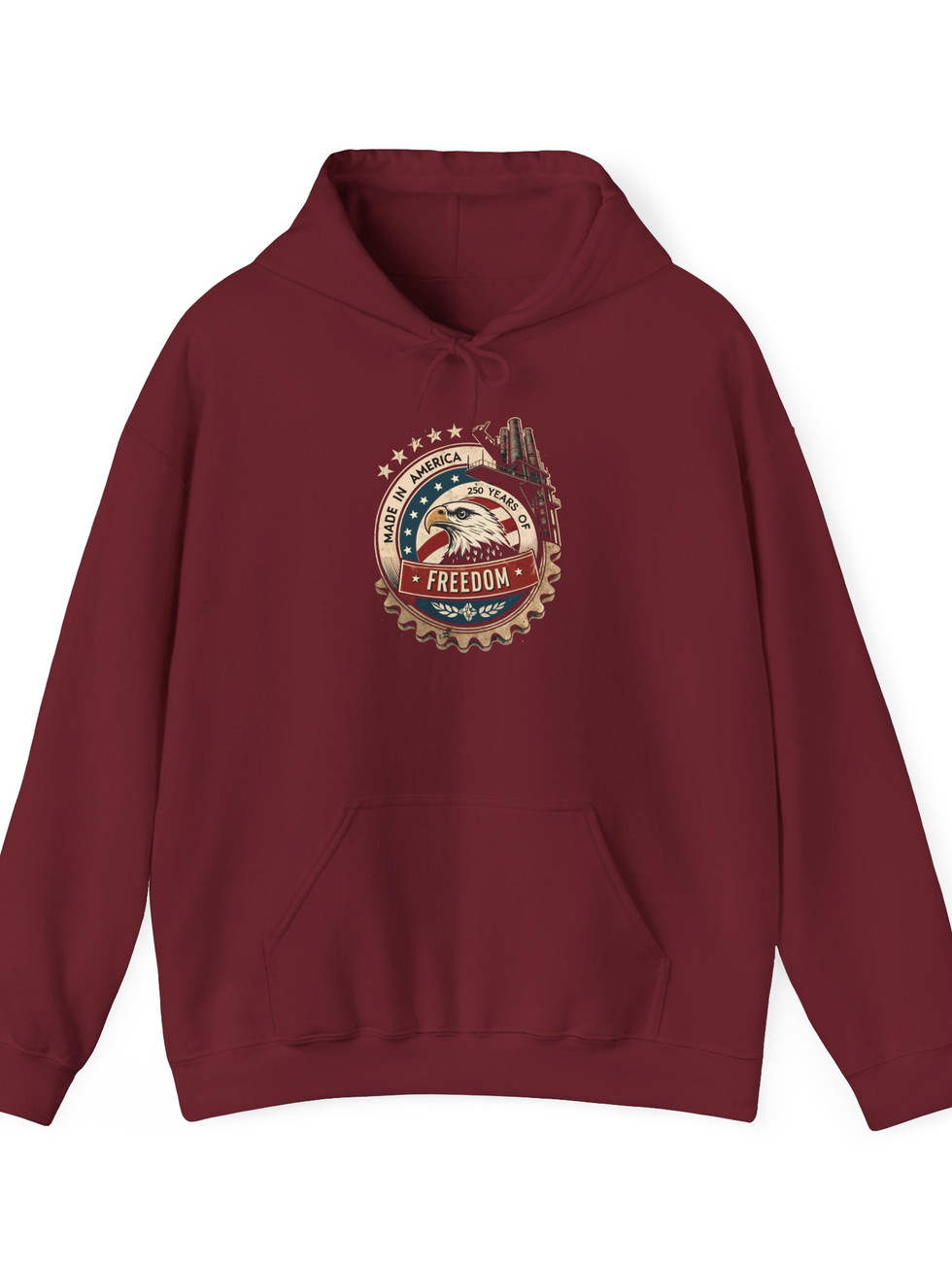 This midweight hooded sweatshirt carries a rugged, Americana-inspired patch graphic at chest — vintage flag tones, mountains and a classic truck wheel blend into a worn-metal badge that reads “FREEDOM.” It drapes with relaxed, classic fit, a double-lined hood and color-matched drawcords for a cohesive look. The roomy kangaroo pocket keeps hands warm on early-morning drives or campsite coffee runs. Built from a durable 50/50 cotton–polyester blend, the fabric holds prints and embroidery well while offering soft, cozy warmth for cooler days. Subtle distressing in the design gives a lived-in, road-ready feel that pairs with jeans, work boots, or a faded cap.
