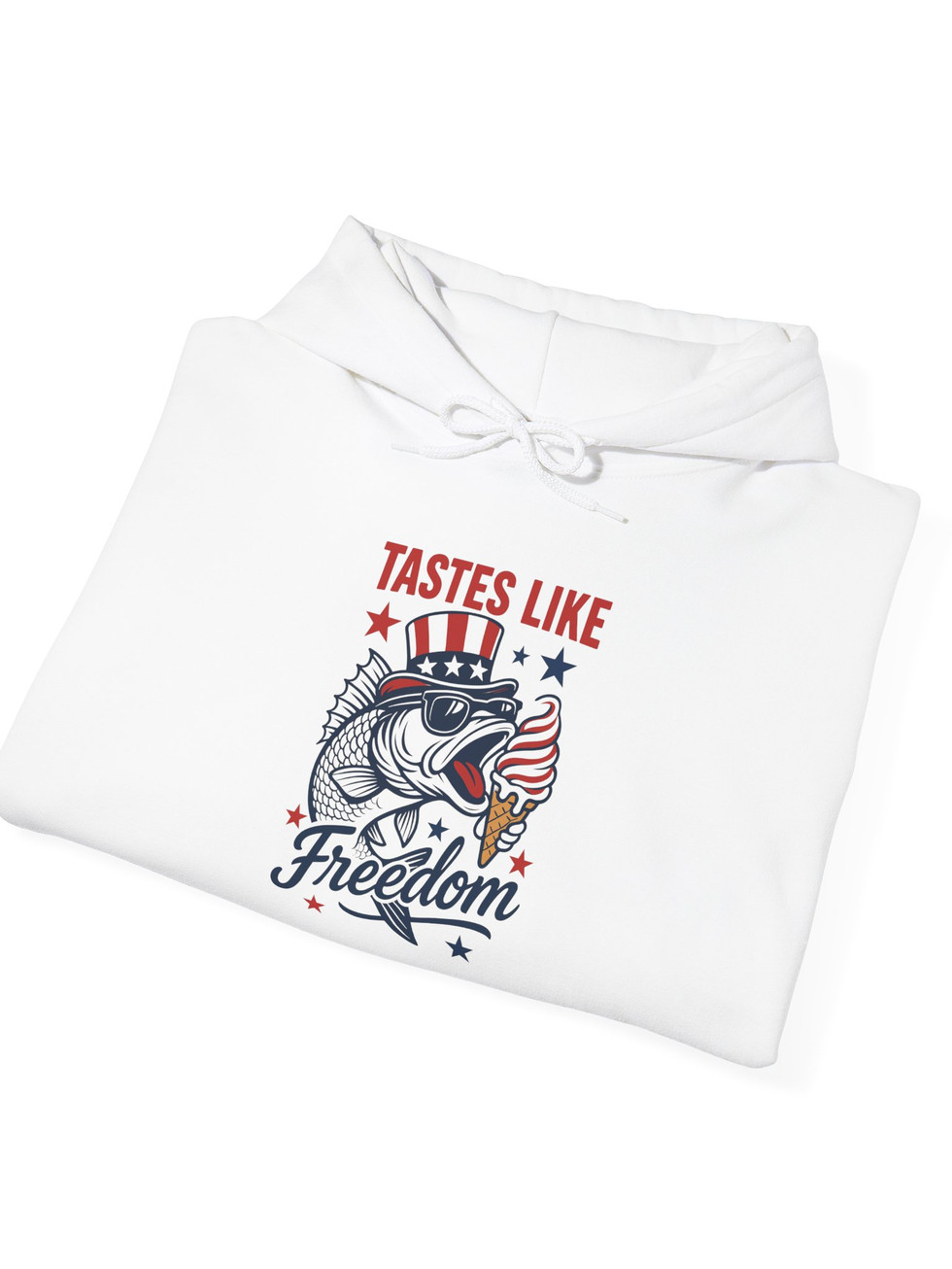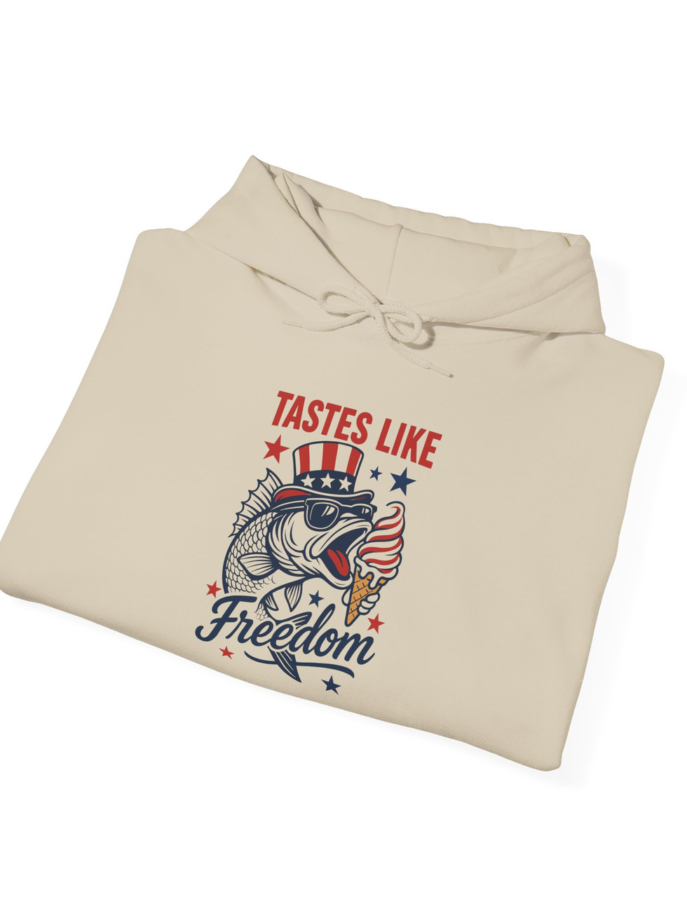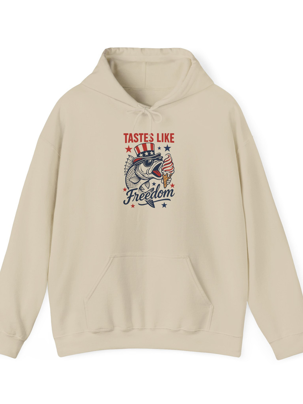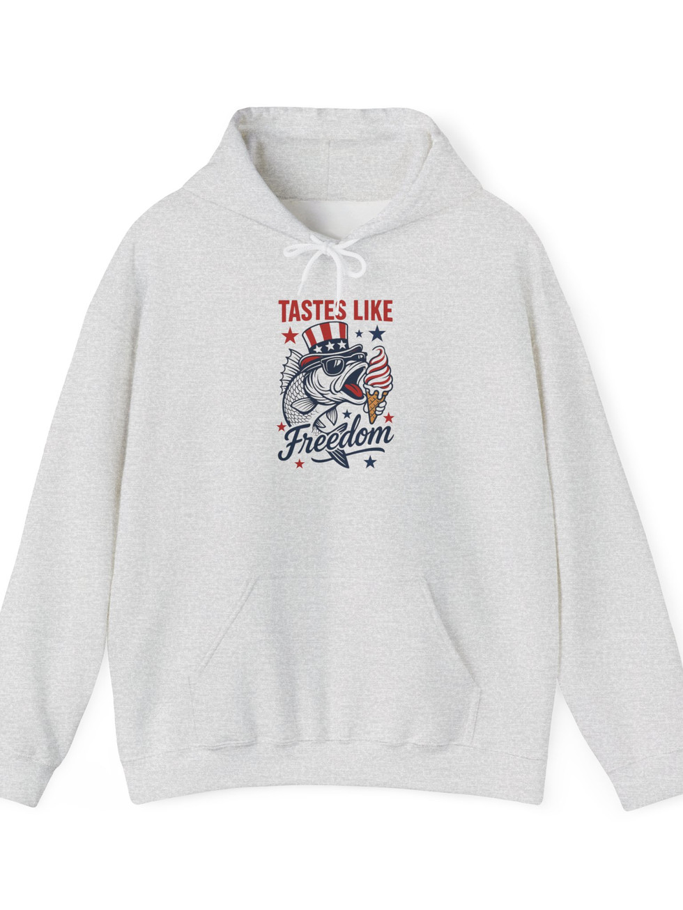 A cozy, midweight hooded sweatshirt with a bold, retro Americana fish-and-bbq graphic that reads “Tastes Like Freedom.” Soft 50/50 cotton-poly fabric gives a warm, brushed feel without being bulky. The tubular knit construction creates a smooth silhouette and reduced seams for comfort, while the double-lined hood and color-matched drawcord add durability and style. Roomy kangaroo pocket keeps hands warm. Subtle DTF/DTG print details keep the graphic crisp and long-lasting. Wear this when you want a laid-back, cheeky nod to backyard barbecues, lake days, and slow evenings around the fire.