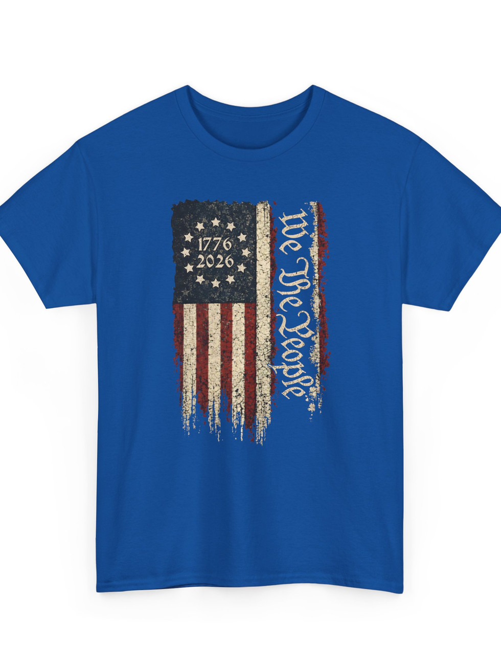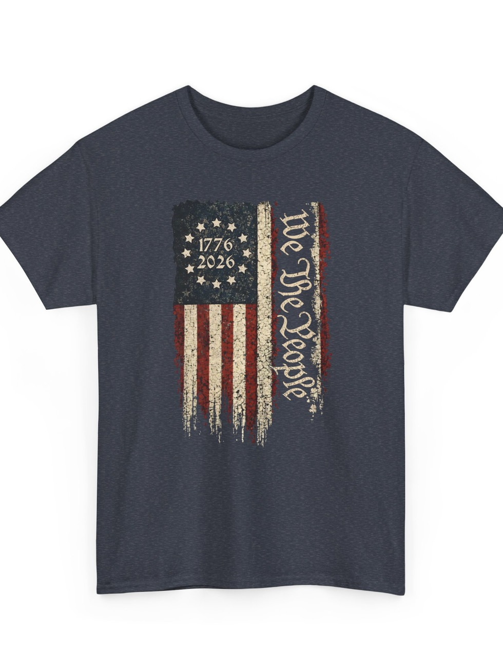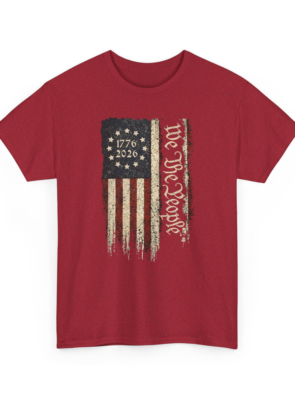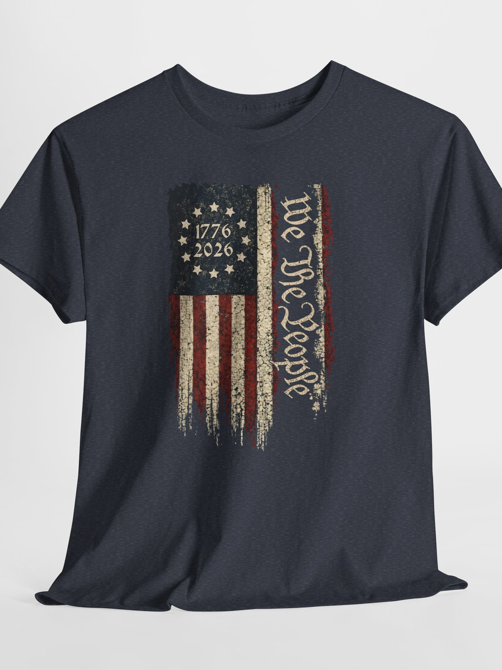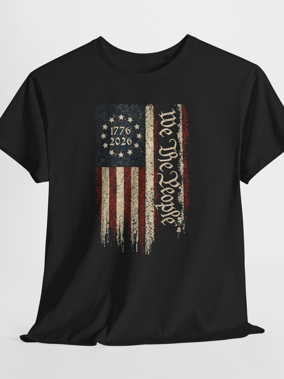 A rugged, vintage-inspired tee that wears like a memory of summer parades and late-night porch talks. The front sports a distressed flag motif split with the script “We the People” and the dates 1776–2026, giving this shirt a lived-in look that reads like a quiet declaration. The medium-weight cotton holds shape yet breathes — great for long days outdoors or layered under a jacket when the night cools. It settles comfortably on the shoulders, the ribbed collar stays put, and the tear-away label keeps the back of your neck irritation-free. Wear it to backyard barbecues, civic gatherings, or when you want a piece that nods to history without shouting. The muted tones and weathered print let the design blend into everyday life while still carrying personality and meaning.
